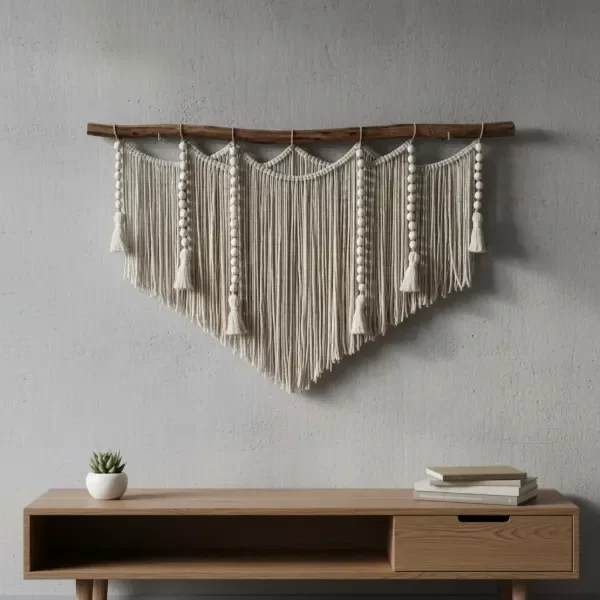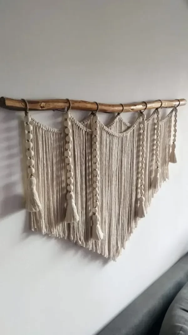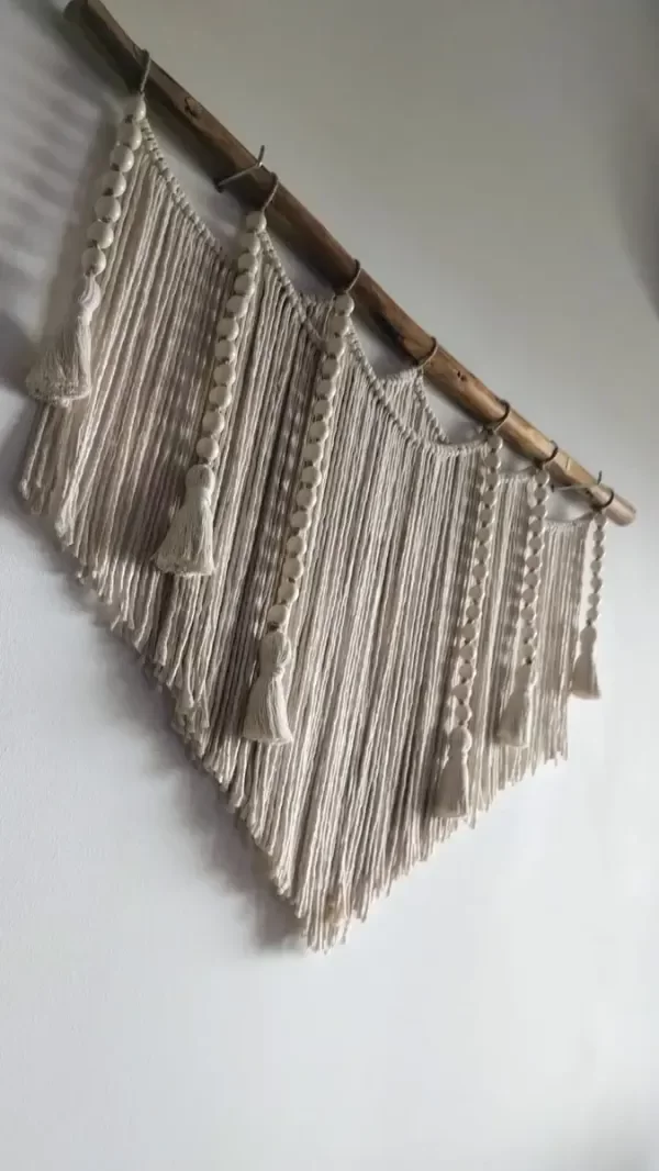 ✨ Trabajo realizado sobre tronco de eucalipto con hilo de algodón color crudo y bolitas de madera.