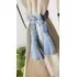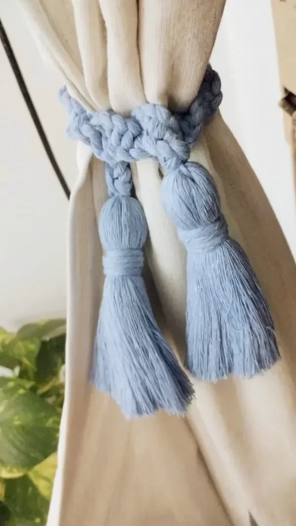 Trabajo realizado con hilo de algodón color celeste. Medidas aproximadas: 50 cm largo total (30 cm. para atar + 10 cm cada borla)