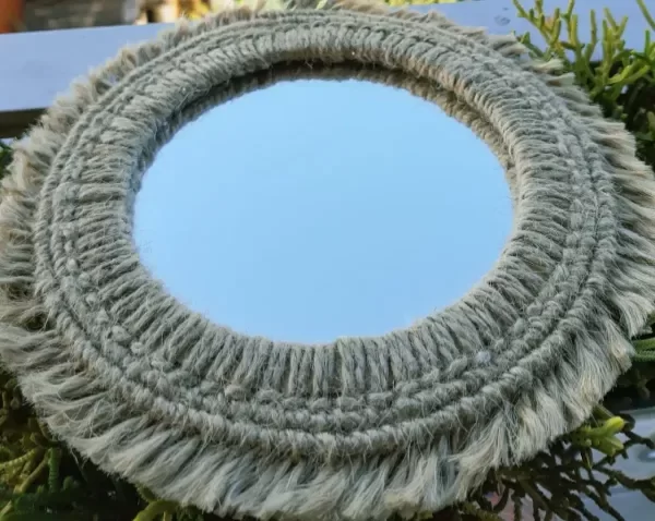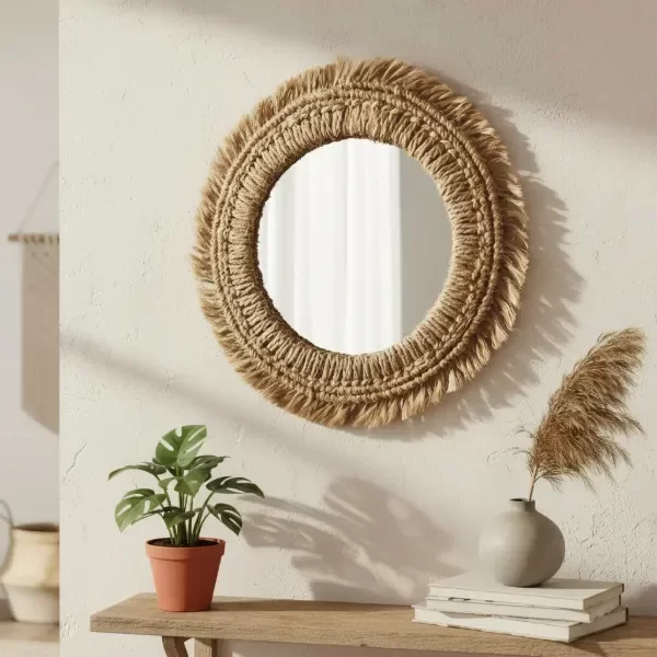 Espejo redondo de yute decorativo “Amelie” — una pieza artesanal que combina estilo boho rústico con funcionalidad.