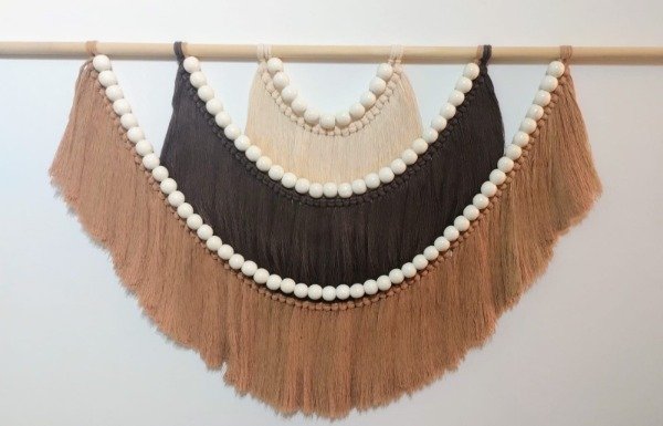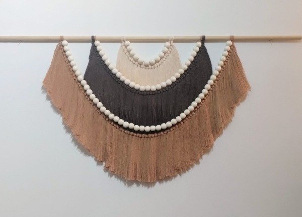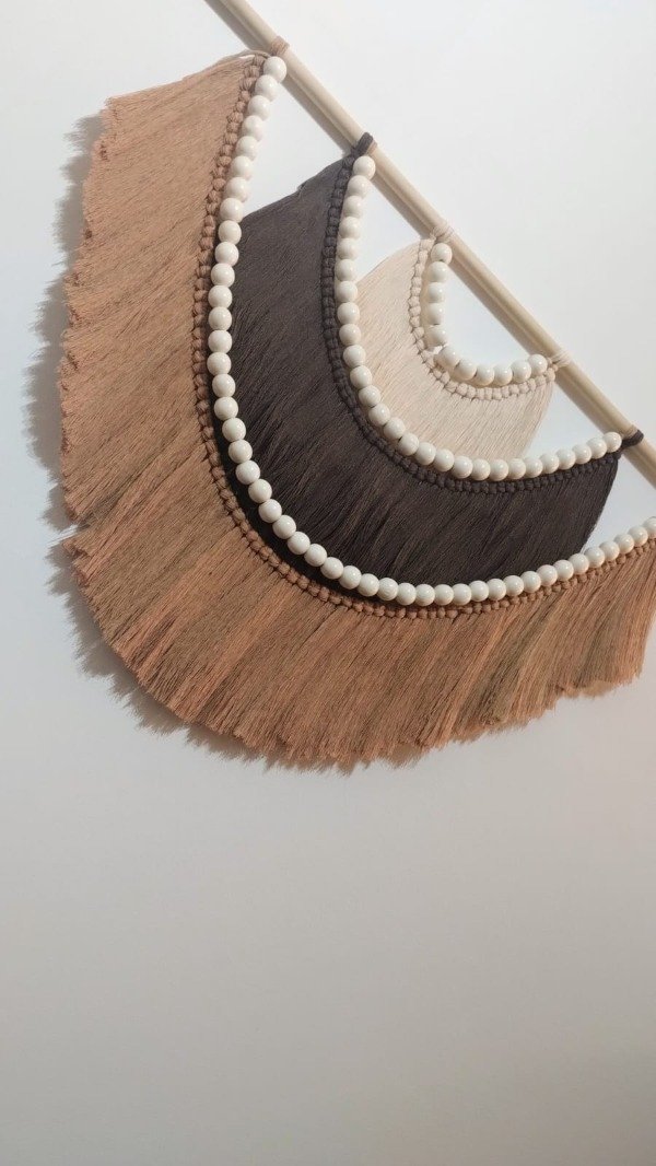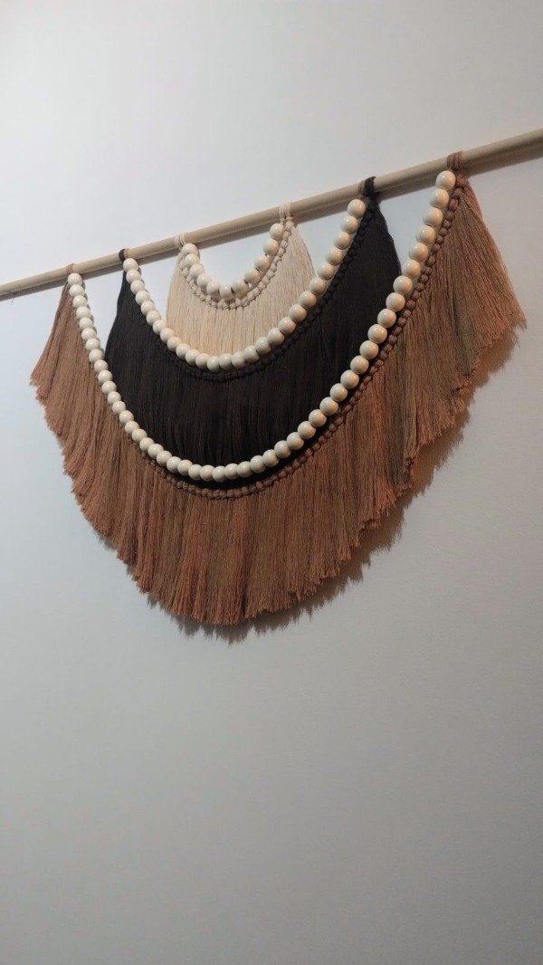 ✨ Trabajo realizado con hilo de algodón color arena, chocolate y camel sobre varilla de pino con esferas de madera.